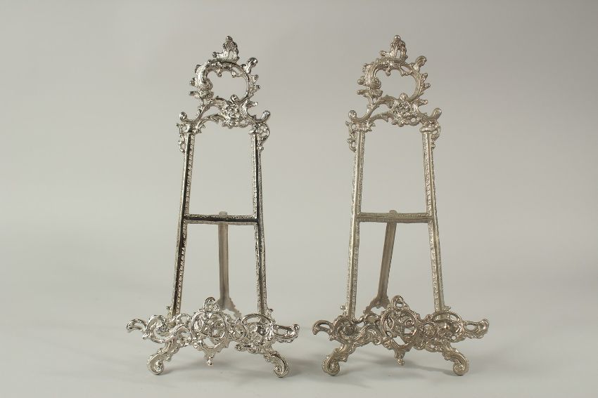 A PAIR OF SILVER PLATED PICTURE EASELS.