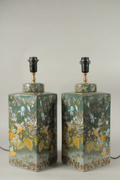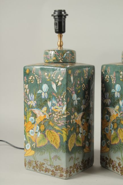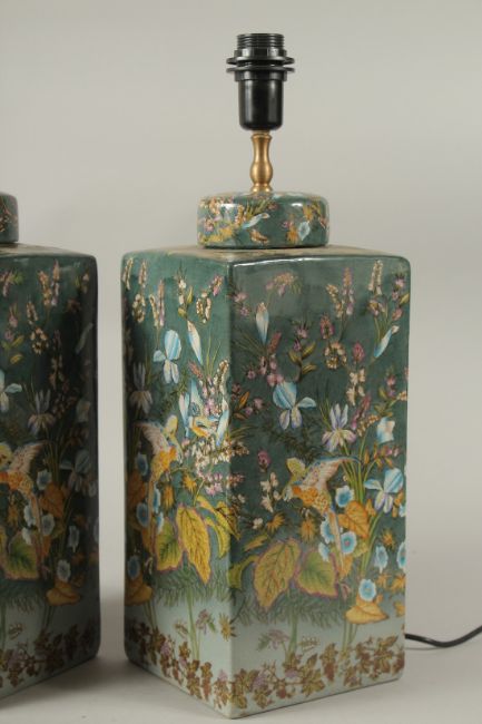 A GOOD PAIR OF PORCELAIN SQUARE LAMPS decorated with parrots and flowers.
