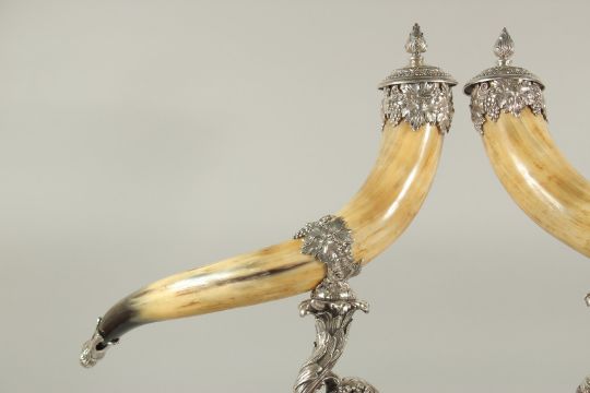 A SUPERB LARGE PAIR OF MOUNTED HORN AND PLATE TABLE CENTREPIECES, the horns 22ins long with fruiting vine mounts and supported by a cherub on a stepped circular marble base.