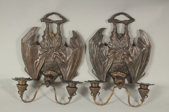 A PAIR OF BRONZE BAT SCONCES with double scrolling branches.