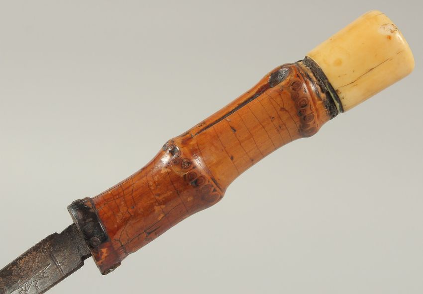 AN EARLY BAMBOO SWORD STICK with bone handle and finely engraved blade.
