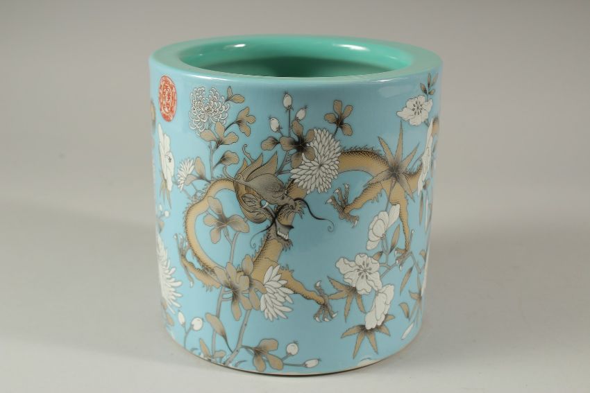 A CHINESE PORCELAIN BRUSH POT decorated with dragons.