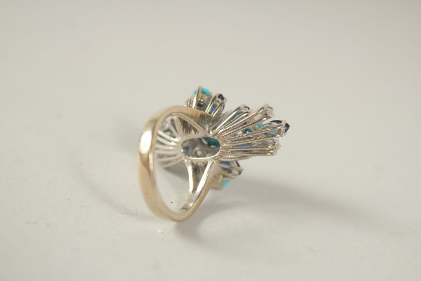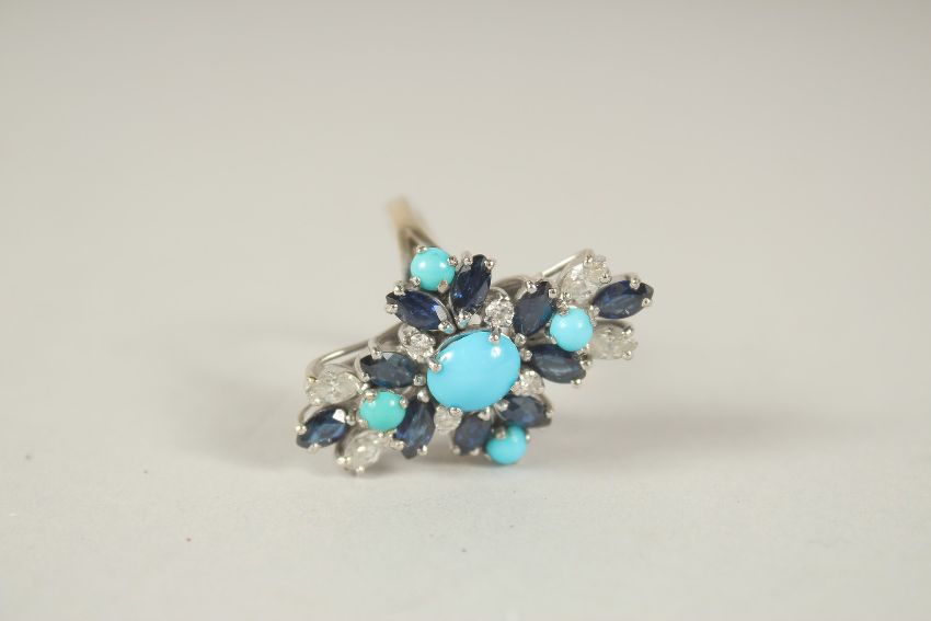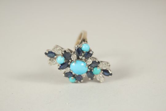 AN 18CT GOLD, SAPPHIRE, DIAMOND AND TURQUOISE RING.