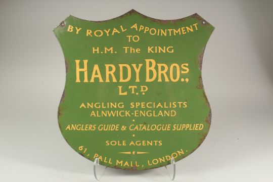 A GREEN HARDY BROS SHIELD SHAPED FISHING SIGN.