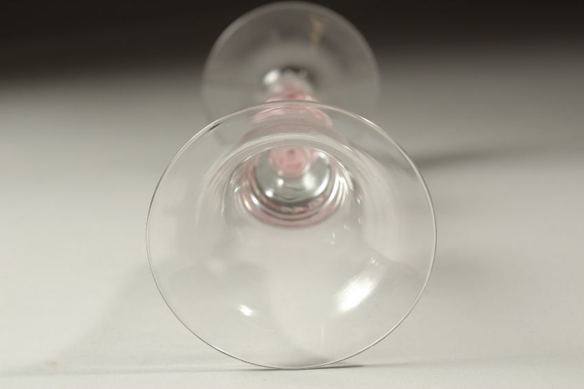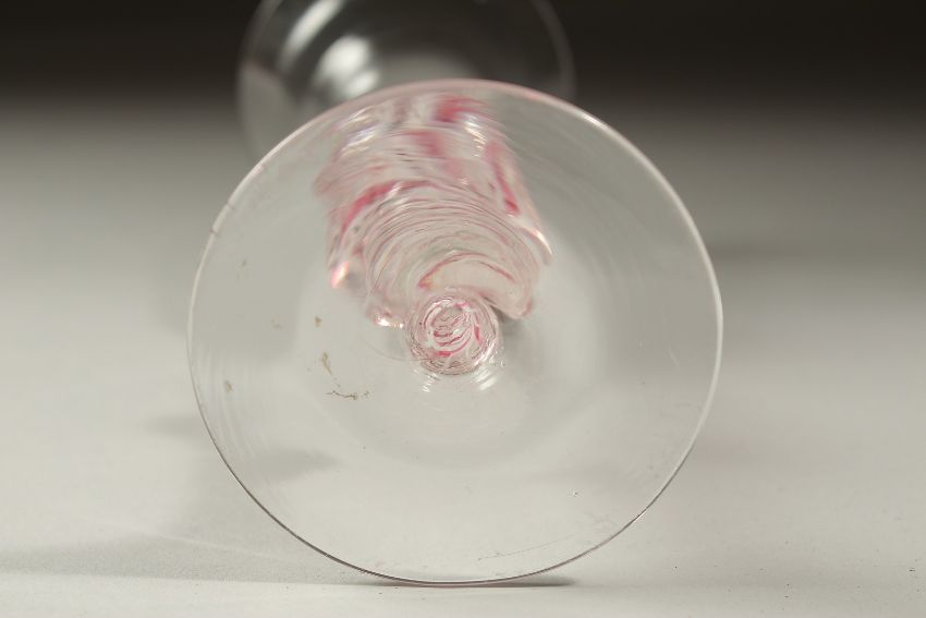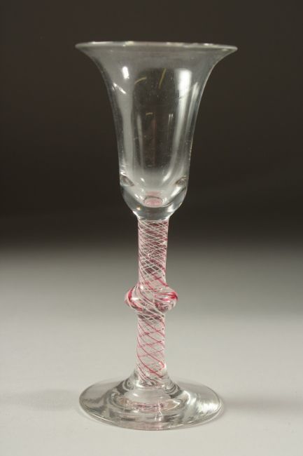 A DUTCH WINE GLASS with inverted bell bowl and coloured twist stem and knop.