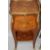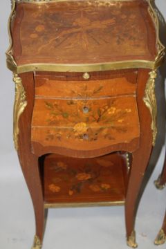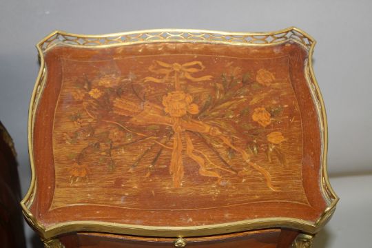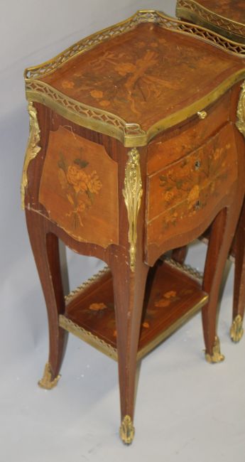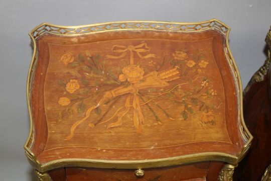 A SMALL PAIR OF LOUIS XVITH INLAID BEDSIDE CABINETS with brass gallery, brushing slide and three drawers with under tier, on curving legs.