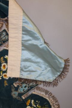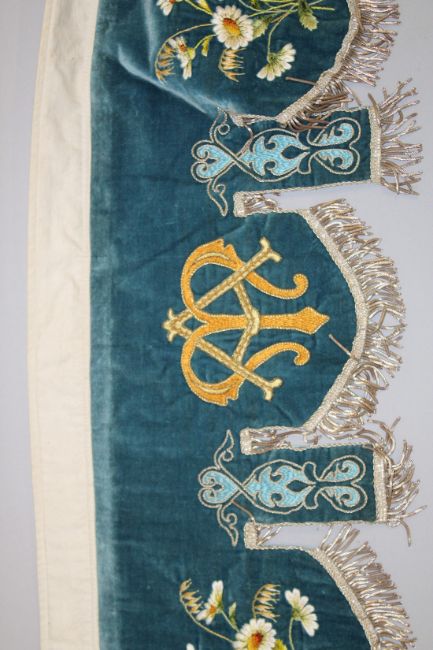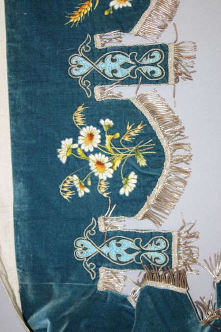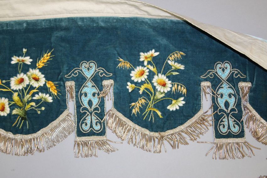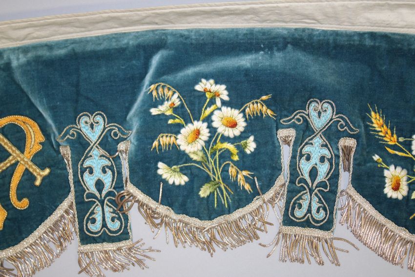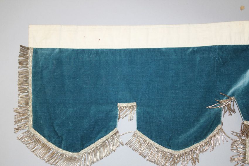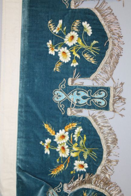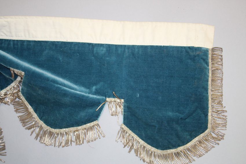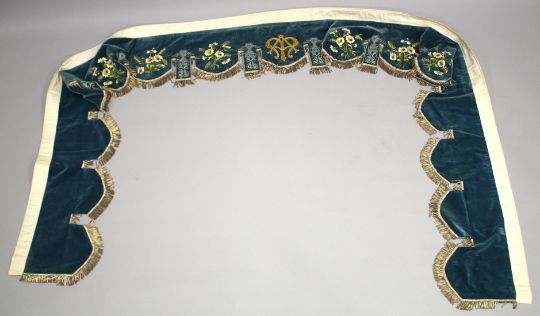 A FINELY EMBROIDERED BLUE VELVET BED HANGING.