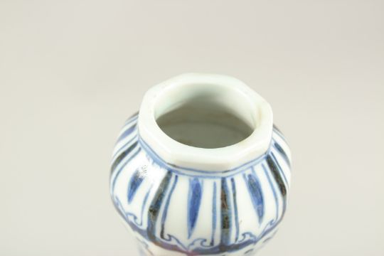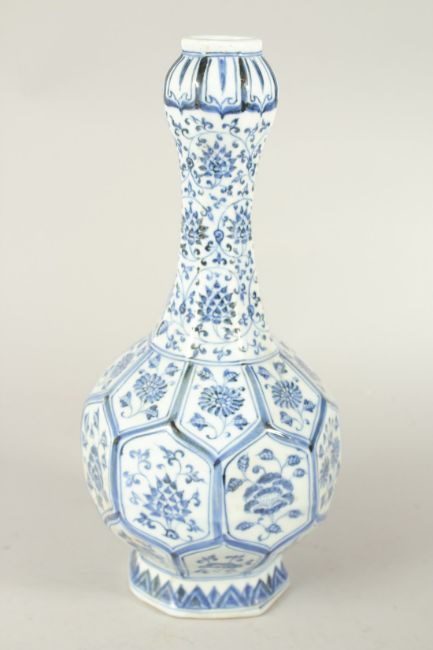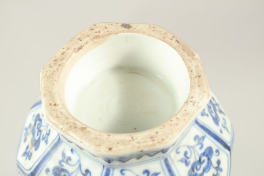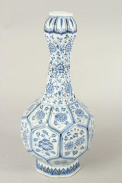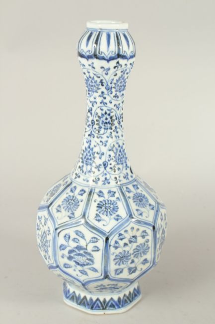 A CHINESE BLUE AND WHITE GARLIC HEAD OCTAGONAL VASE, with floral panels.