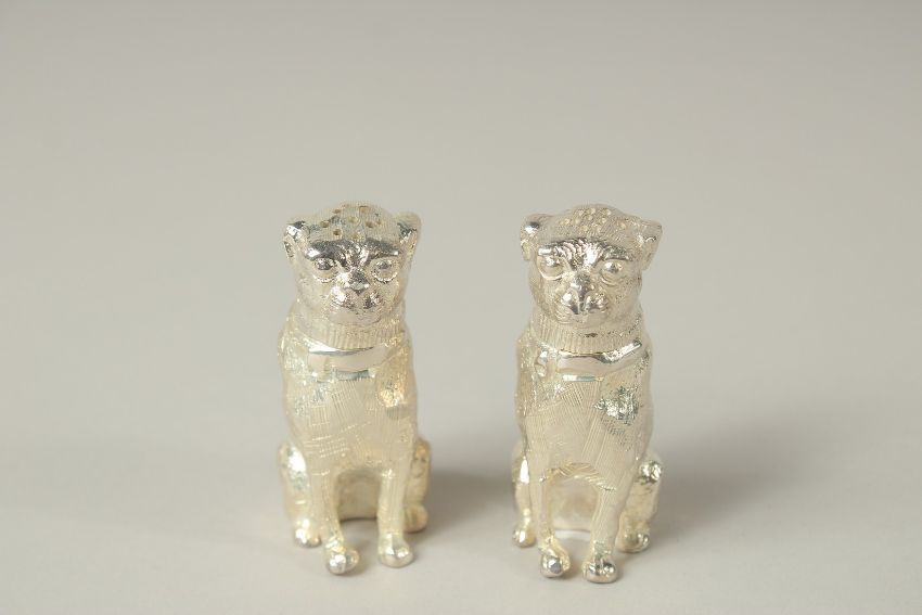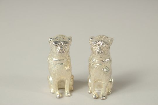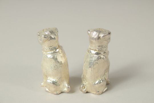 A SMALL PAIR OF PLATED BULLDOG SALTS AND PEPPERS.