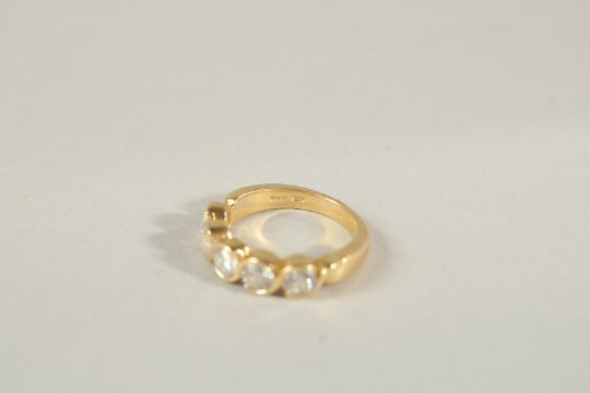 A GOOD 18CT GOLD FIVE-STONE DIAMOND HALF HOOP RING.