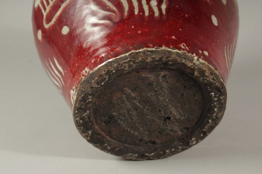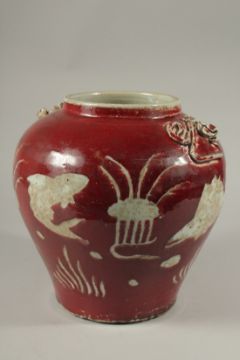 A CHINESE RED POTTERY BULBOUS VASE decorated with fish.