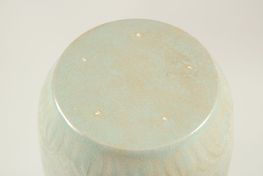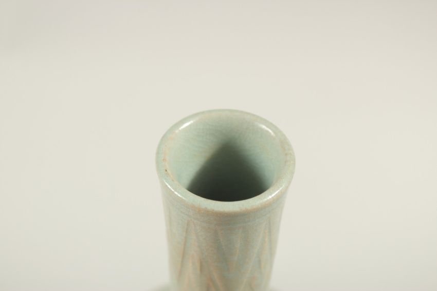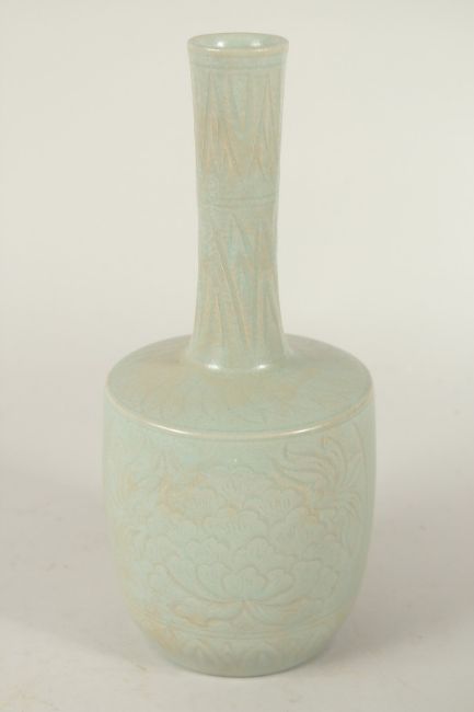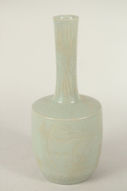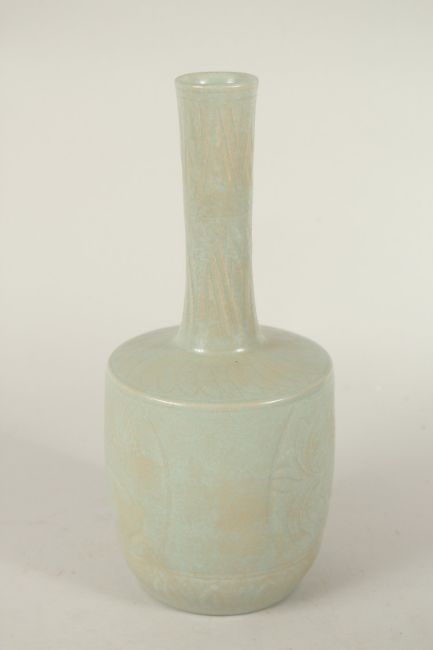 A CHINESE CELADON GLAZE VASE, with carved deer and flora.