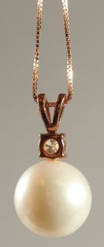 A 9CT ROSE GOLD LARGE CULTURED PEARL AND DIAMOND NECKLACE, boxed. RBC diamond 0.23ct.