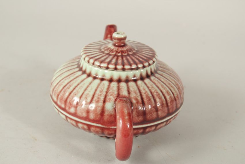 A CHINESE RED GLAZE PORCELAIN TEAPOT, the base with a character mark.