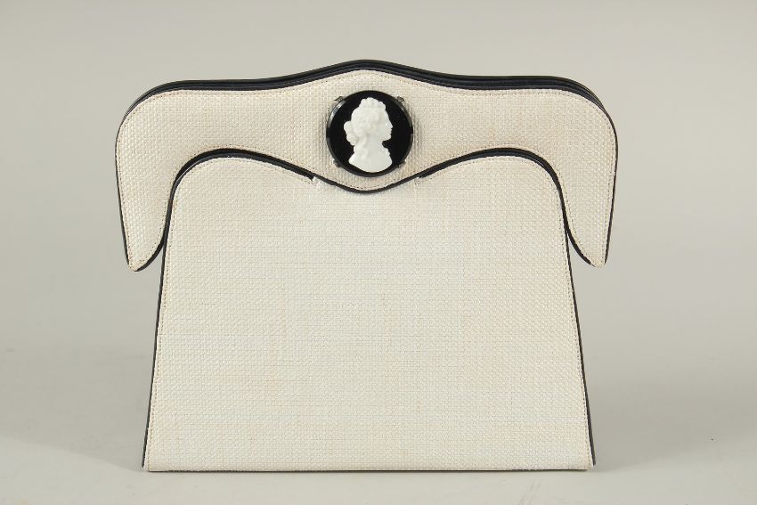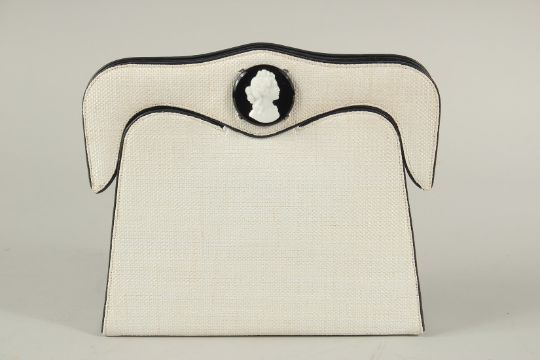 A RENAUD PELLEGRINO, PARIS, WHITE HESSIAN BAG with a cameo.
