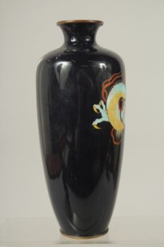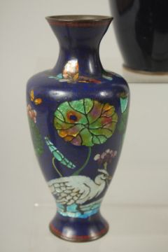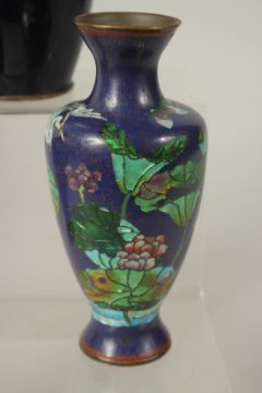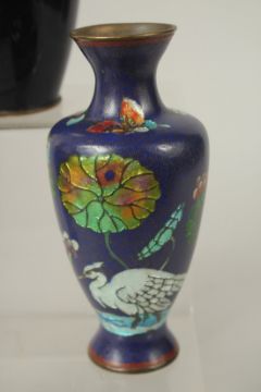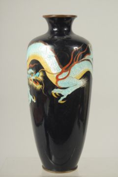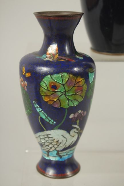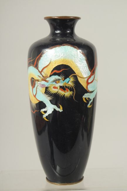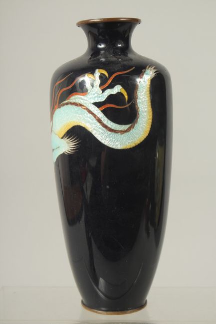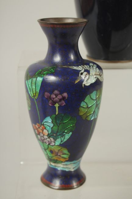A CHINESE BLACK GROUND CLOISONNE VASE, 24cm high, together with a smaller pair of vases, (3).