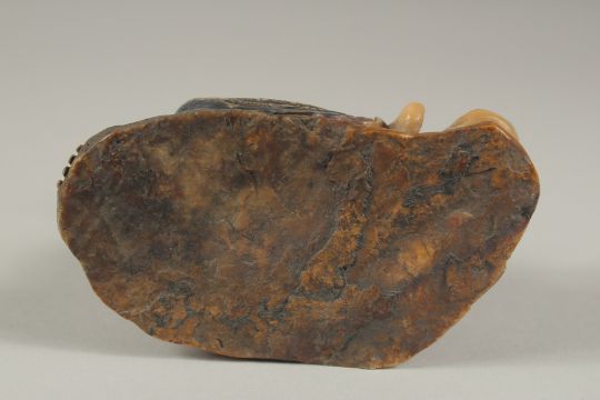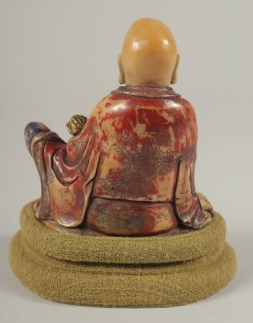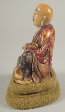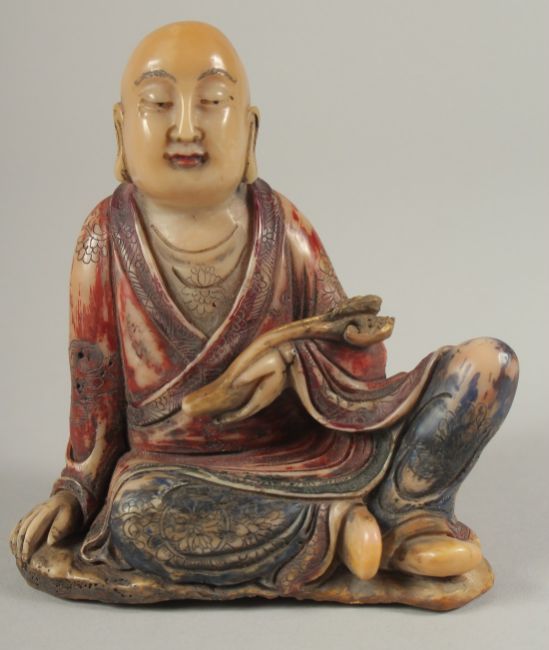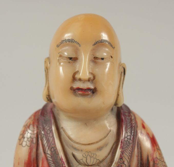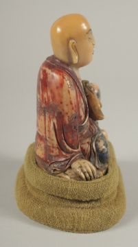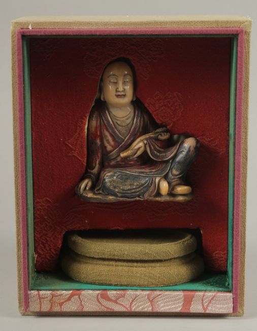 A CHINESE CARVED HARDSTONE FIGURE OF LUOHAN, holding ruyi scepter, with fabric overlaid stand and original fitted box, figure 10cm high.