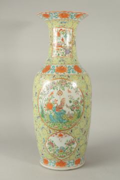 A LARGE 19TH CENTURY CHINESE GREEN GROUND FAMILLE ROSE PORCELAIN VASE, painted with various panels of flora and fauna, with bats and objects, the shoulder with a band of large flower heads, and further decorated with enamelled curling vine motif, 62.5cm high.