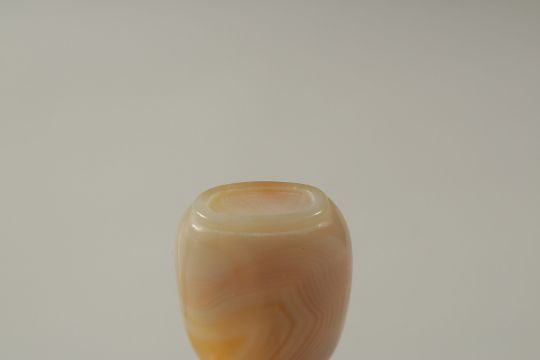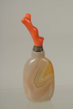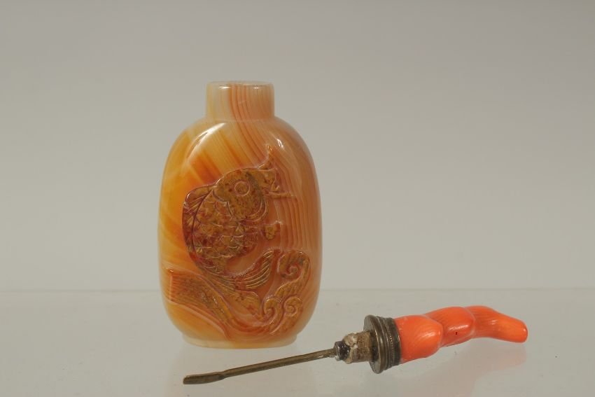 A CHINESE AGATE SNUFF BOTTLE WITH CORAL STOPPER, the bottle carved with carp, 11.5cm high overall.