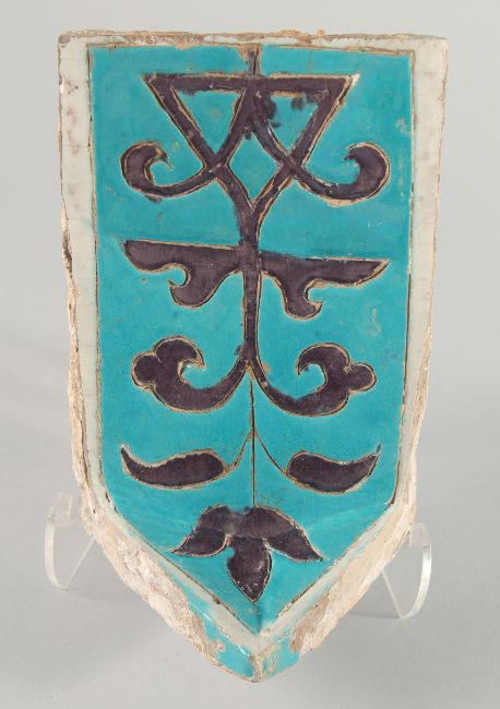 A RARE 14TH CENTURY PERSIAN OR CENTRAL ASIAN TIMURID GLAZED POTTERY MUKARNAS TILE, with turquoise glaze and central motif, 25cm long, 16cm wide.