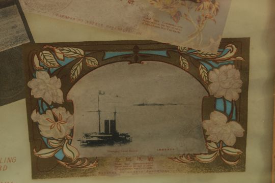 A LARGE JAPANESE COMMEMORATIVE PRINT FOR THE RUSSO-JAPANESE WAR, C.1906, with several interesting images, framed and glazed, 42cm x 54.5cm overall.