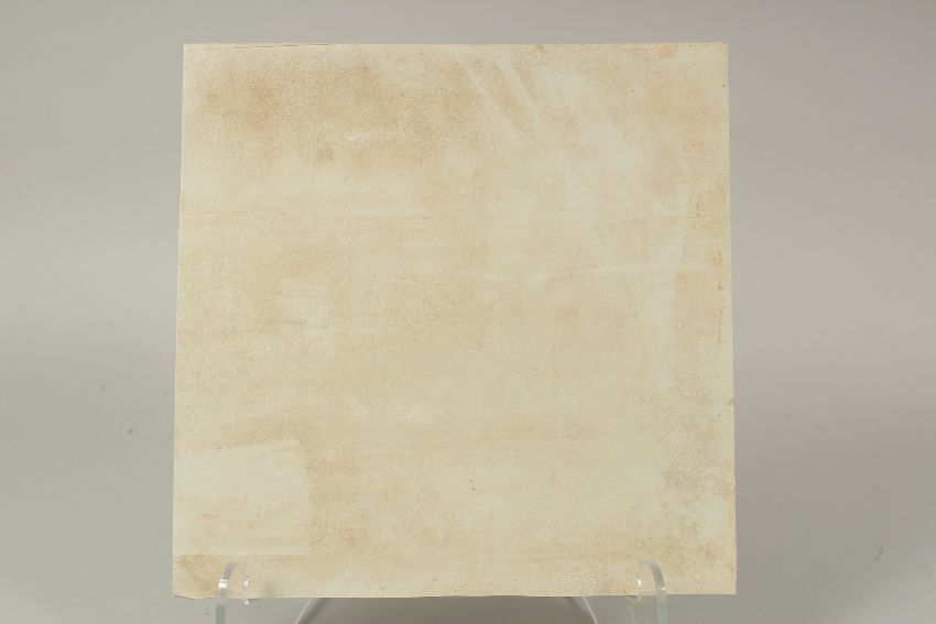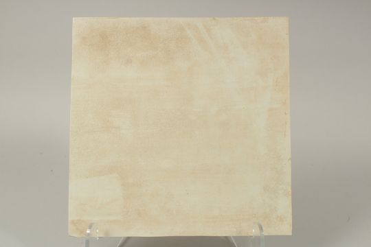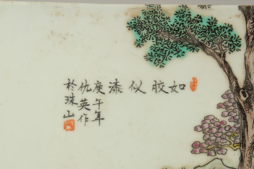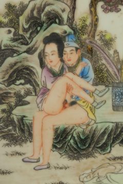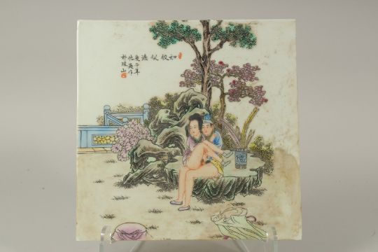 A CHINESE EROTIC POLYCHROME PORCELAIN PLAQUE, depicting two lovers beneath a tree and calligraphy inscription, 30cm square.