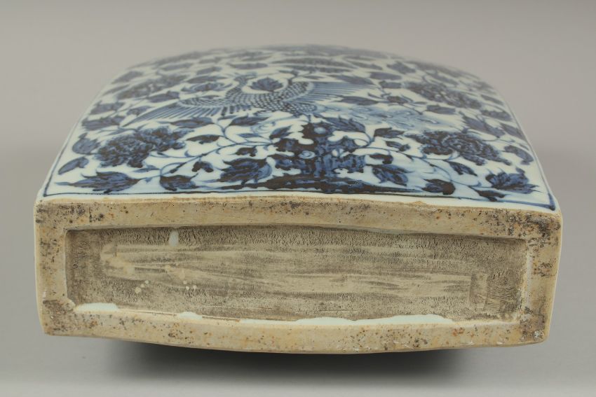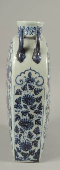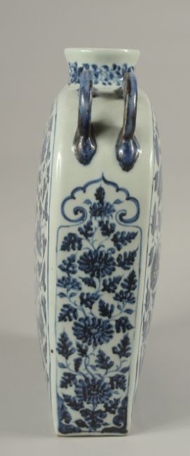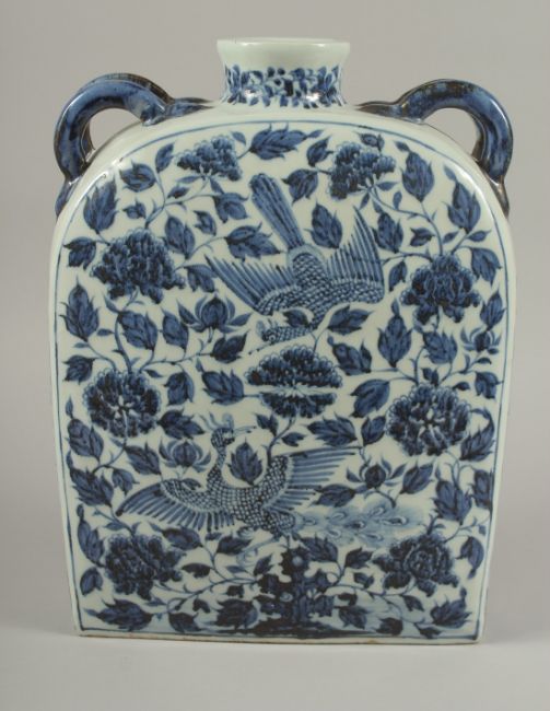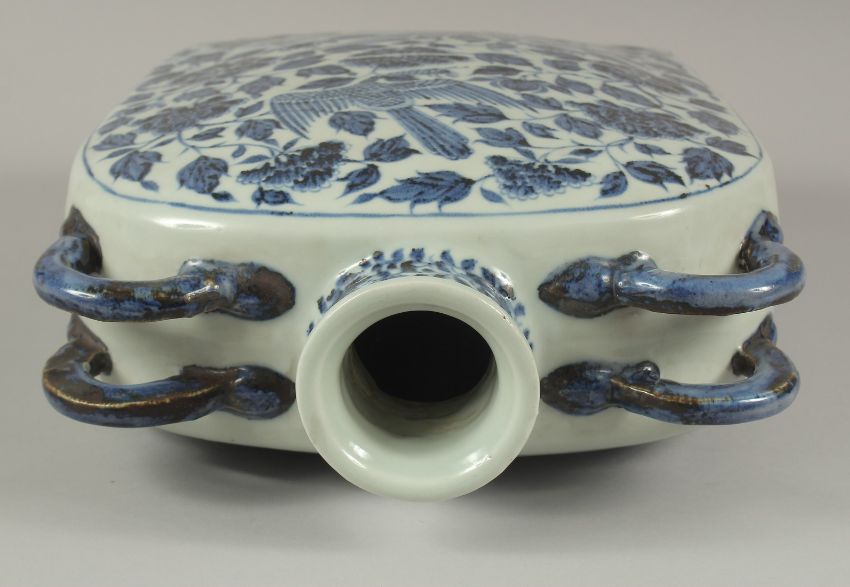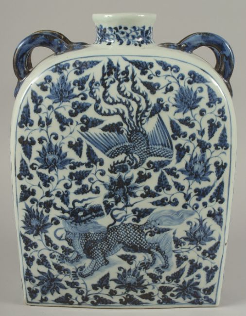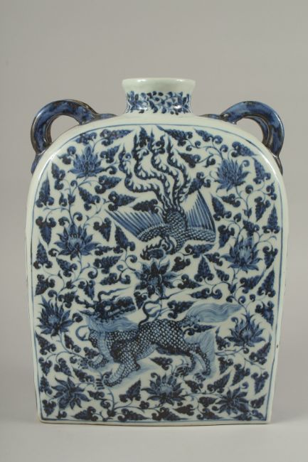 A VERY LARGE CHINESE BLUE AND WHITE PORCELAIN WATER FLASK, with double-twin handles and painted with mythical foo dog and phoenix amongst flora and vines, 38.5cm high, 29cm wide.