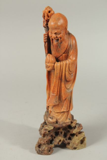 A FINELY CARVED CHINESE CORAL-RED SOAPSTONE FIGURE OF SHOU LAO, raised upon a rocky mound, 30cm high.