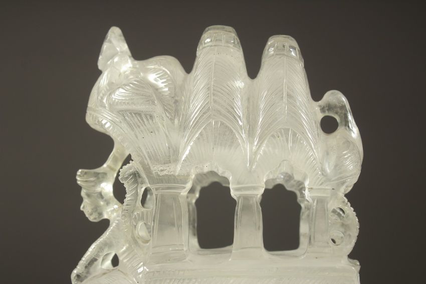 A RARE LARGE LATE 19TH CENTURY INDIAN CARVED ROCK CRYSTAL ELEPHANT WITH HOWDAH, 22.5cm high.