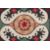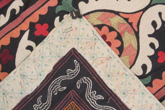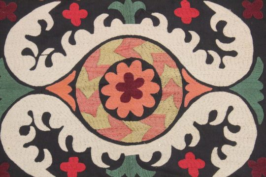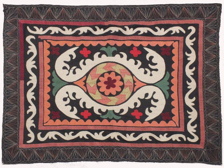 AN UZBEK SUZANI EMBROIDERED TEXTILE, with central foliate motif in orange, green, maroon, red, and yellow, on black and cream, 101cm x 81cm.