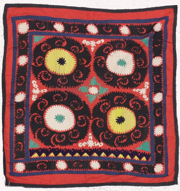 AN UZBEK SUZANI EMBROIDERED TEXTILE, with floral motifs in yellow, green, blue, black, and cream, on red ground, 100cm x 90cm.