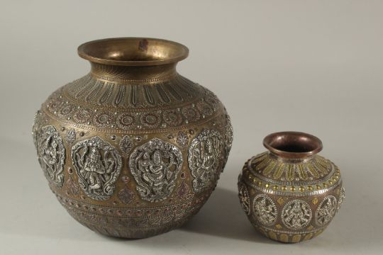TWO 19TH CENTURY SOUTH INDIAN TANJORE GANGA JUMNA SILVER INLAID LOTA VESSELS, with embossed panels of deities, largest 16.5cm high, (2).