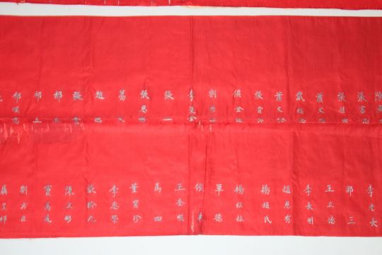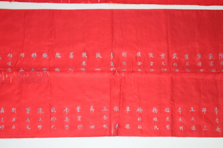 A LARGE PAIR OF CHINESE EMBROIDERED RED SILK PANELS.