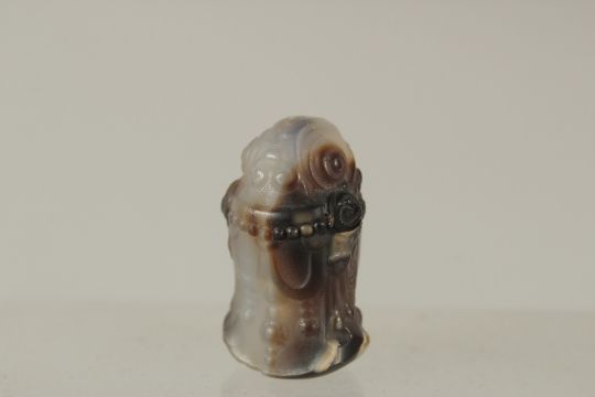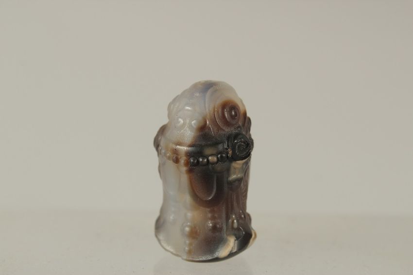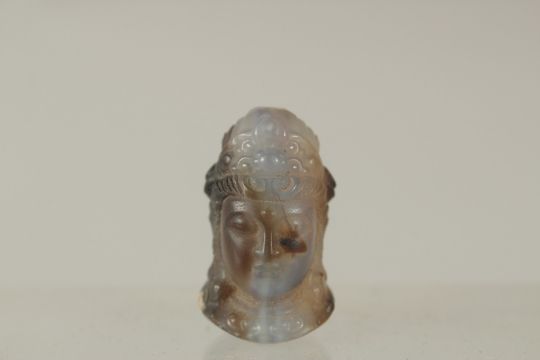A FINE AGATE BUDDHA HEAD BEAD, 3.5cm long.