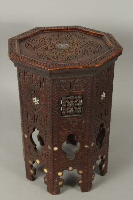 A MOORISH MOTHER OF PEARL INLAID CARVED WOOD HEXAGONAL TABLE, 47cm high.
