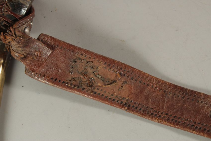 A FINE 19TH CENTURY ARAB SAUDI WAHABI SILVER MOUNTED HORN HILTED DAGGER WITH ORIGINAL BELT, dagger 46cm long.