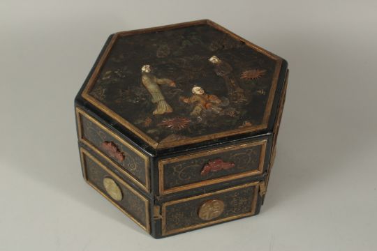 A CHINESE SOAPSTONE INSET LACQUERED WOOD HEXAGONAL BOX, the top decorated with a scene of carved soapstone figures with bone faces, the box further adorned with various stones depicting characters and flowers, 31cm at widest point.