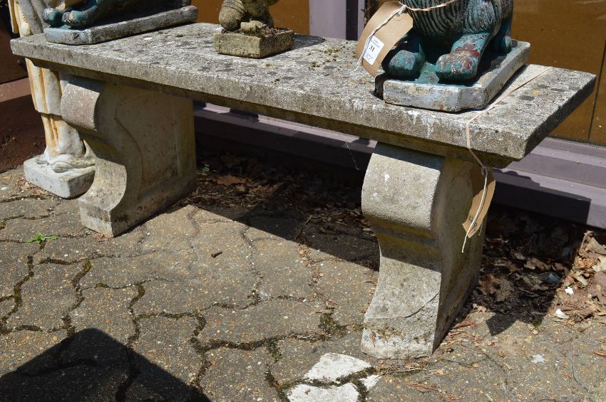 A reconstituted stone rectangular garden bench with curving supports.