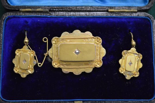 A Victorian yellow metal garniture comprising brooch and pair of earrings, boxed.