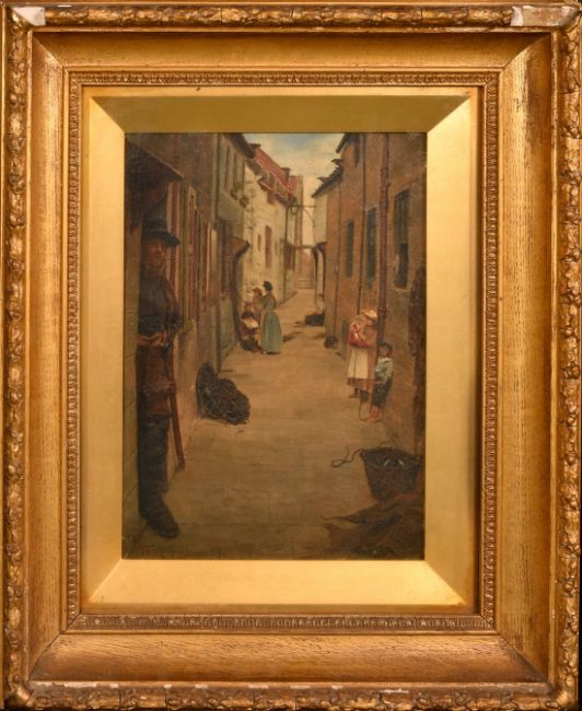 Alfred Armitage, Late 19th Century, 'The Cross, Whitby', figures in a narrow street, oil on canvas, signed, inscribed verso, 14" x 10" (36 x 25cm).