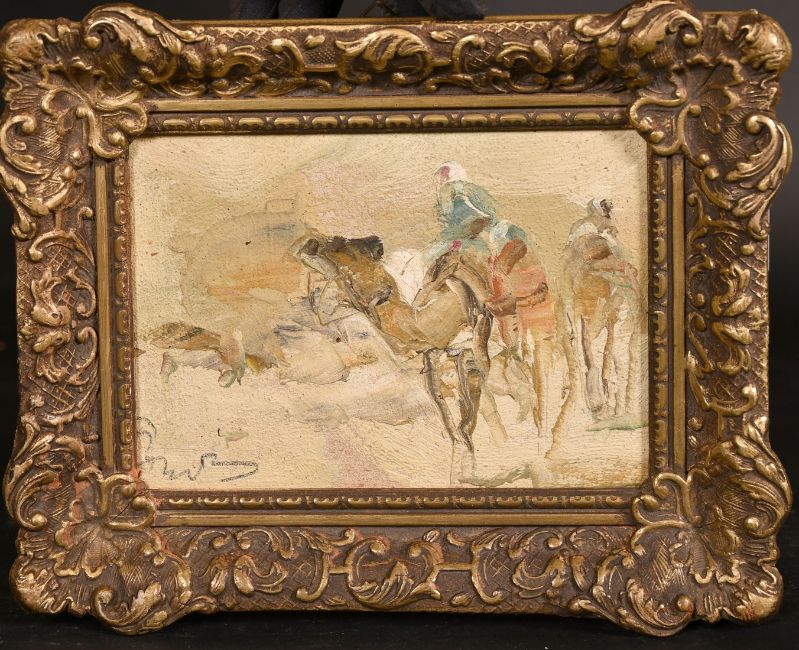 Early 20th Century School, a pair of oil on canvas North African views of figures on camels amongst buildings, indistinctly signed, 5.25" x 7.25" (13.5 x 18.5cm), (2).
