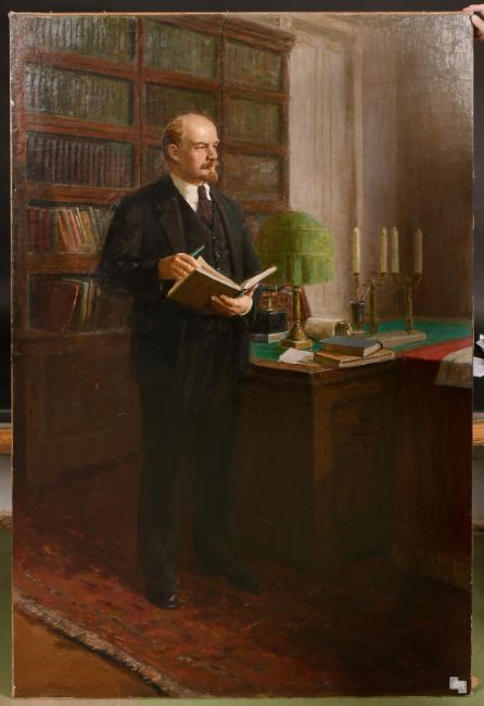 20th Century Soviet Subject, Lenin stood in an office holding a book, oil on canvas, 72.5" x 48.75" (184 x 124cm), unframed.