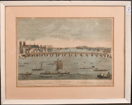 An 18th Century Vue d'Optique of Westminster Bridge, hand coloured engraving, 11" x 15" (28 x 38cm).