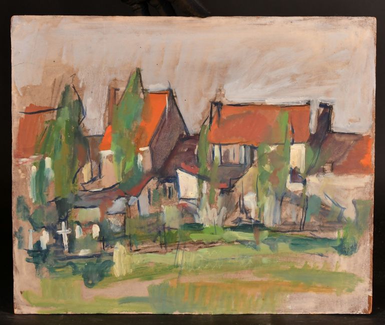 George Weissbort (1928-2013), a semi abstract landscape view with figures, oil on board, unframed, 16" x 24" (40 x 61cm), along with an unframed oil on board, study of houses, 15" x 18" (38 x 46cm), (2).