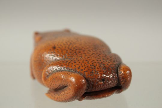 A SUPERB JAPANESE CARVED WOOD FROG with glass eyes.