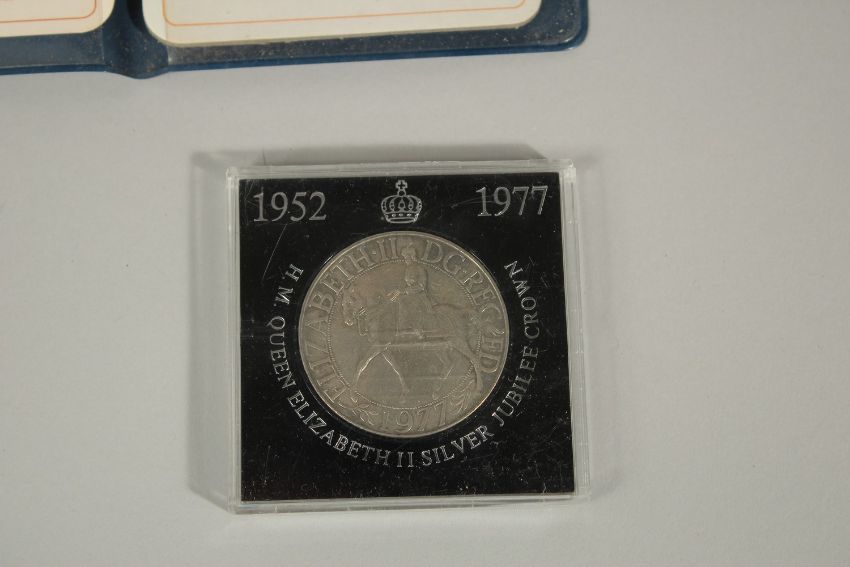 FIRST DECIMAL SET, TWO FESTIVAL OF BRITAIN CROWNS, 1953, set in perspex, 1952 - 1977, THREE CROWNS, 2015. Royal Bary silver cover