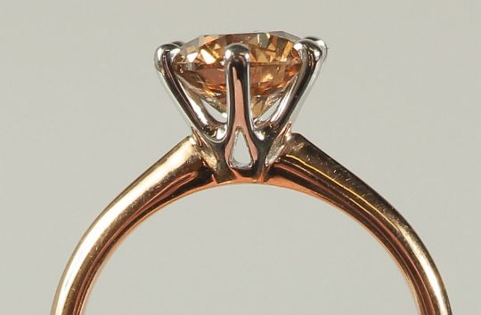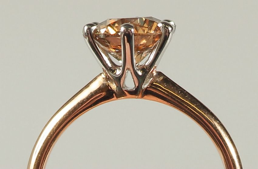AN 18ct ROSE AND WHITE GOLD SIX CLAW SET RBC DIAMOND SOLITAIRE RING, boxed. Fancy orangish brown diamond 1.82ct.