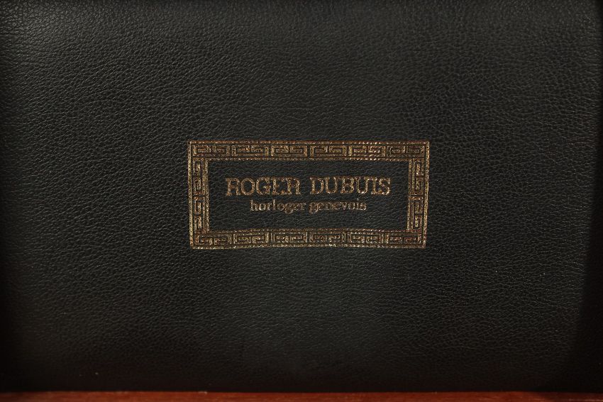 A VERY GOOD ROGER REBUS 18ct GOLD WRISTWATCH with leather strap, No. 06128, in a good inlaid wooden box and leather outer case.