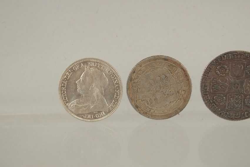A VICTORIA SIXPENCE 1893, UNC, A GEORGE III SIXPENCE, 1817, A GEORGE III SIXPENCE, 1820