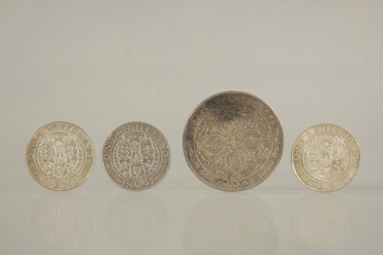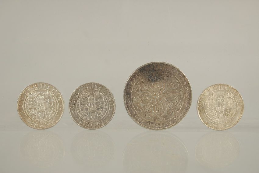 THREE VICTORIA VEILED HEAD SHILLINGS, 1893, 1891 & 1897, and STRAITS SETTLEMENT DOLLAR, 1908 (4).
